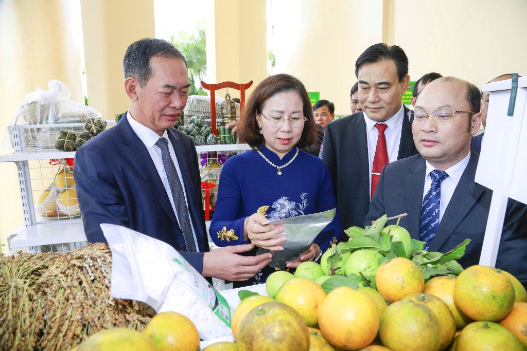 | Lãnh đạo HND Việt Nam và lãnh đạo tỉnh, HND tỉnh thăm gian hàng trưng bày sản phẩm OCOP của hội viên nông dân. |