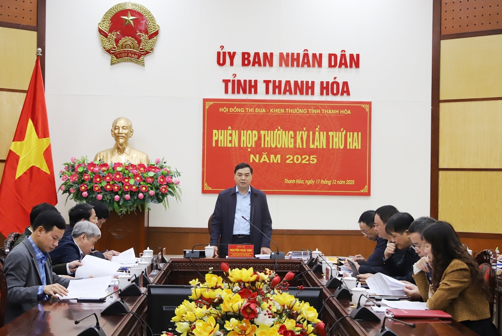 Sáng ngày 17/12/2025, đồng chí Nguyễn Hoài Anh, Ủy viên dự khuyết Trung ương Đảng, Phó Bí thư Tỉnh ủy, Chủ tịch UBND tỉnh, Chủ tịch Hội đồng Thi đua – Khen thưởng (TĐ-KT) tỉnh chủ trì hội nghị họp Hội đồng TĐ-KT phiên thường kỳ lần thứ hai năm 2025 và nghe báo cáo Dự thảo Quyết định ban hành Quy định về công tác TĐ-KT trên địa bàn tỉnh Thanh Hóa (thay thế Quyết định số 68/2024/QĐ-UBND ngày 29/10/2024 của UBND tỉnh).
