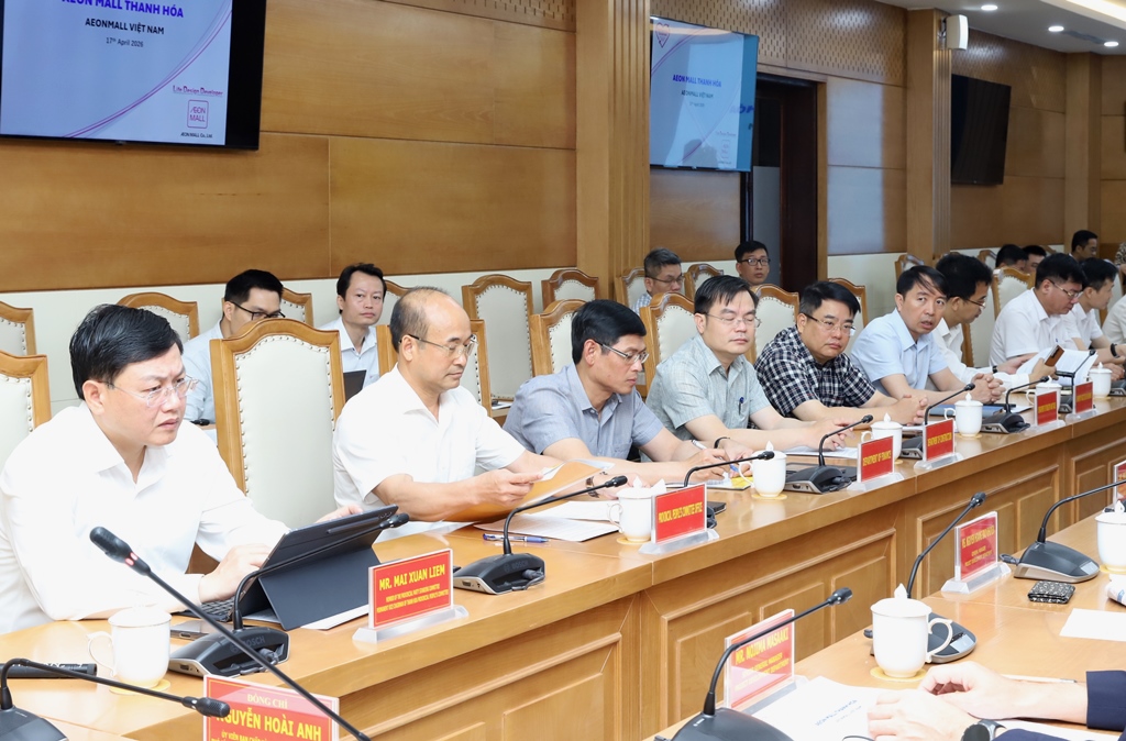 Sáng ngày 17/4/2026, đoàn công tác của Công ty TNHH Aeon Mall Việt Nam do ngài Nojima Masaaki, Tổng Quản lý cấp cao Ban phát triển dự án làm trưởng đoàn đã có buổi làm việc với UBND tỉnh về tình hình triển khai, khó khăn, vướng mắc và giải pháp bảo đảm tiến độ dự án Trung tâm thương mại Aeon Mall Thanh Hóa.